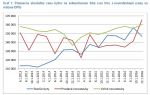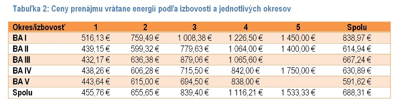 Pokiaľ ide o ceny prenájmov, tie spolu s energiami dosiahli v štvrtom kvartáli priemernú výšku 688 € mesačne. Vzhľadom na predchádzajúce kvartály tak došlo k značnému poklesu. Najmä voči tretiemu štvrťroku, keď boli priemerné ceny prenájmu ešte na úrovni 804 € mesačne. Zmena v cene však bola vyvolaná len zmenou štruktúry ponuky, ktorá sa presunula smerom k menším bytom. V našej vzorke bytov sa totiž výrazne zvýšil podiel jednoizbových bytov (z 13,7% na 21%), zatiaľ čo počet troj a štvorizbových bytov poklesol (z 36,6 na 30,6%). Dôvodom rastu počtu malých bytov je predovšetkým ich uvoľnenie z dôvodu presmerovania dopytu z prenájmu v takejto nehnuteľnosti do kúpy vlastnej nehnuteľnosti, a teda výmeny platenia nájmu za úver, ktorý dnes vychádza častokrát výhodnejšie.