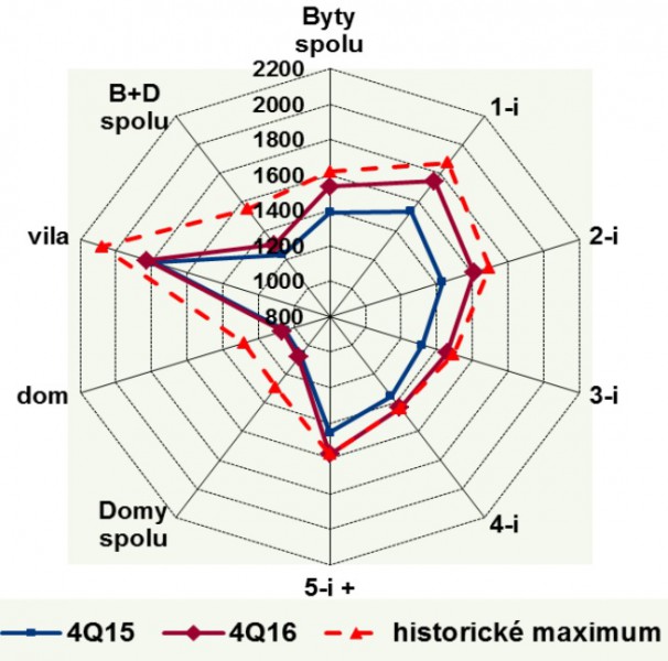 Na dvojcifernom medziročnom raste priemernej ceny bytov sa vo 4. štvrťroku 2016 najvýraznejšie podieľal rast cien menších bytov. Na medziročnej báze najviac rástli ceny jednoizbových bytov (až o takmer 14 %) a najmenej rástli ceny štvorizbových bytov (o vyše 6 %). K zníženiu úhrnnej ceny domov vo 4. štvrťroku 2016 (o 1,8 % oproti predchádzajúcemu štvrťroku) prispelo v rozhodujúcej miere zníženie priemernej ceny rodinných domov (o 21 EUR/m2, resp. o 2 %). Ceny priestrannejších rodinných víl sa v porovnaní s predchádzajúcim štvrťrokom znížili len o 5 EUR/m2.
