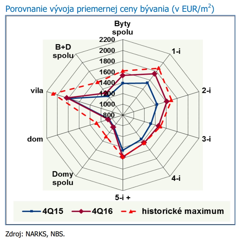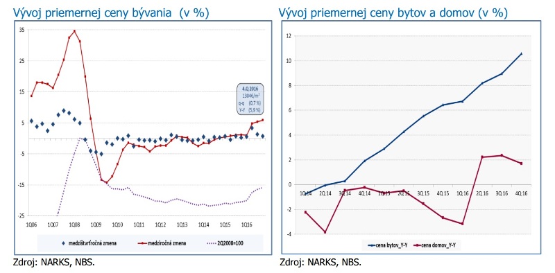 Priemerná cena bývania vzrástla vo 4. štvrťroku 2016 v porovnaní s predchádzajúcim štvrťrokom o 9 EUR/m2 na hodnotu 1304 EUR/m2. Znamená to medzištvrťročný rast o 0,7 % a medziročný rast o 5,8 %. Medziročný rast priemernej ceny bytov medziročne zrýchlil o 1,6 percentuálneho bodu na 10,6 %, kým pri domoch sa spomalil o 0,6 percentuálneho bodu na 1,7 %. Uvedené čísla sú zrejme výsledkom dosť výrazne neuspokojeného dopytu po bytoch v mestách a mierneho previsu ponuky rodinných domov v lokalitách v okruhu väčších miest.