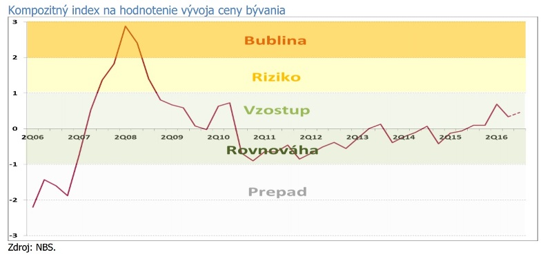 Hodnoty kompozitného indexu sa nachádzali v priebehu roku 2016 v pásme vzostupu. Jeho aktuálna hodnota je však stále pod pásmom rizikového vývoja. Dynamicky rastúca priemerná cena bytov si však zasluhuje zvýšenú pozornosť.