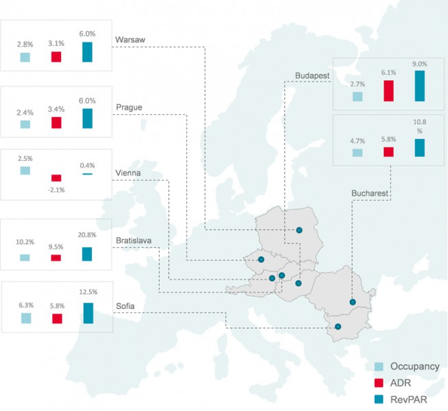 Hotelový priemysel v strednej a východnej Európe zaregistroval rast všetkých kľúčových ukazovateľov. Nárast počtu turistov, cez hodnoty obsadenosti, ktoré sa navrátili k levolom spred krízy alebo ich dokonca predbehli s priemernou obsadenosťou 72%, nárast oproti minuloročným 69%. Keďže náklady na návštevu strednej a východnej Európy narástli popri nárastu cien hotelových izieb, profity prudko stúpajú. Priemerná cena za izbu dosiahla 76,6 eur oproti 73,6 eur v 2015. Zatiaľ čo trhy východnej Európy dosiahli dvojciferný nárast výnosov za izbu, vyspelejšie trhy strednej Európy vrátane Viedne, Prahy a Varšavy zaznamenali 6%-ný nárast.