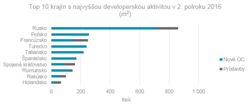 Stredná a východná Európa Turecko má naplánovanú najrozsiahlejšiu výstavbu, čo sa týka Európy pre rok 2017 až 2018, pričom objem plánovanej výstavby predstavuje 1,55 milióna m2. Napriek očakávanému zvýšeniu množstva projektov sú plány pozastavené kvôli politickým a ekonomickým rizikám. Rusko sa radí na druhú priečku vzhľadom na pripravenosť na výstavbu v regióne CEE s objemom výstavby 1,46 milióna m2 a kľúčové projekty zahŕňajú otvorenie nákupného centra s plochou 120 000 m2 s názvom Vegas III v Moskve a prístavbou 107 000 m2 nákupného centra Evropa v meste Kursk. V Poľsku sa v rokoch 2017 až 2018 očakáva výstavba 546 000 m2 nových nákupných priestorov, čo je tretí najväčší objem výstavby v regióne CEE.