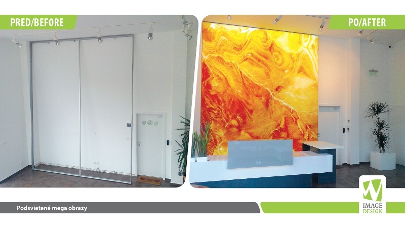 Úspešnou interiérovou dekoráciou nielen vo vstupných halách a na recepciách rôznych obchodných budov, ale taktiež v zasadačkách a rokovacích miestnostiach sú podsvietené textilné obrazy. Ich obsahový návrh, zobrazenie a rozmery sú na prvom mieste určené želaním klienta. Preto môžu variovať od námetov kvetov, miest či neurčitých zobrazení.