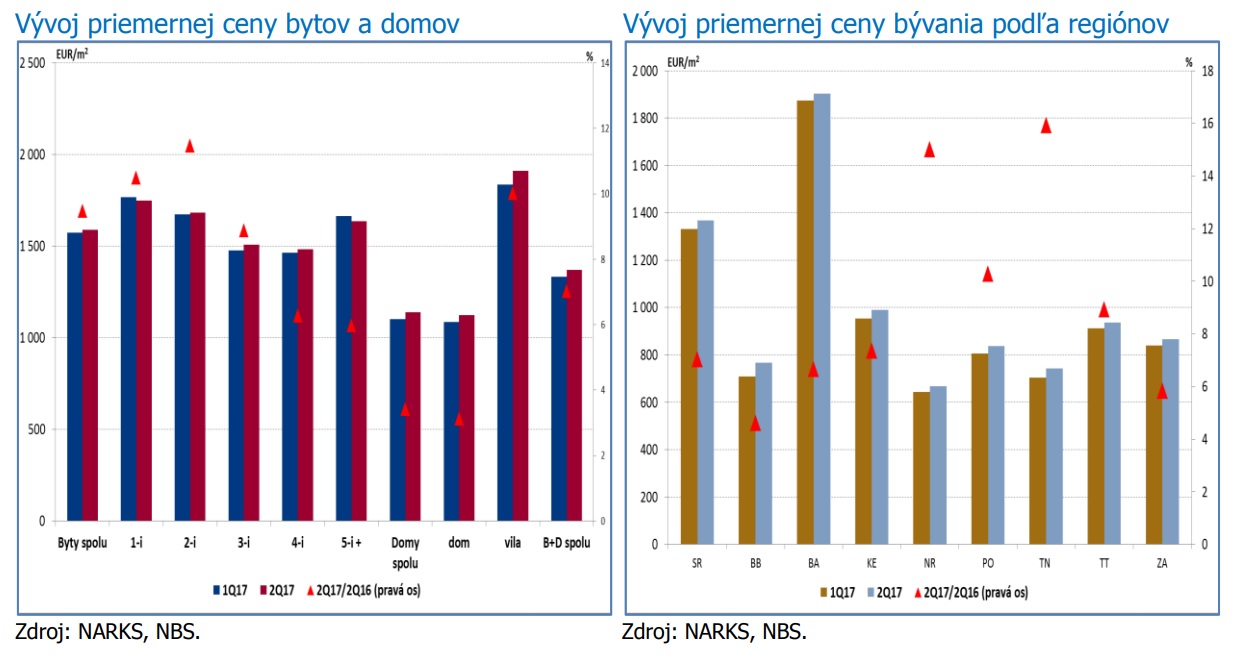 V 2. štvrťroku 2017 vzrástla priemerná cena bývania v porovnaní s predchádzajúcim štvrťrokom o 37 EUR/m2 na hodnotu 1369 EUR/m2 , čo znamená medzištvrťročný rast 2,8 % a medziročný rast o 7,0 %. Spomalenie medziročného rastu je výsledkom hlavne pomalšieho rastu priemernej ceny bytov, ale aj vplyvom bázického efektu výrazného rastu priemernej ceny domov pred rokom.