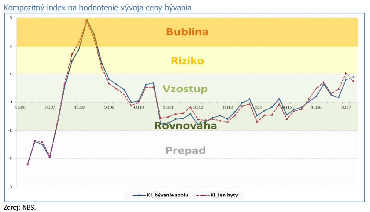Kompozitný index pre priemernú cenu bývania sa aj v 2. štvrťroku 2017 nachádza pod rizikovým pásmom.