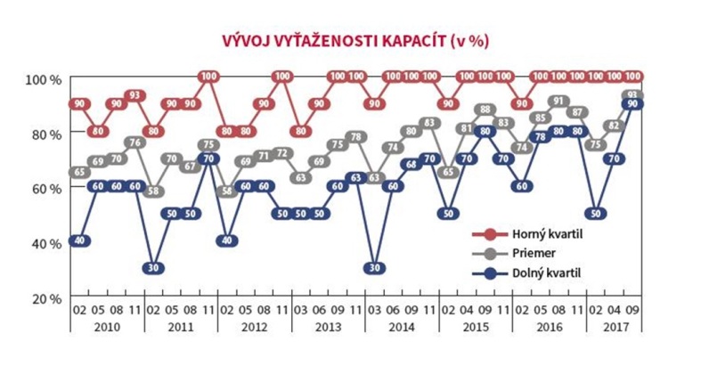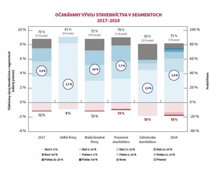 Riaditelia stavebných spoločností očakávajú v roku 2017 zvýšenie výkonu slovenského stavebníctva v priemere o 4,4 percenta. Dariť by sa malo predovšetkým firmám pôsobiacim v sektore pozemných stavieb, veľmi pesimistické sú, naopak, vo svojich predikciách, hlavne veľké stavebné spoločnosti a firmy zamerané na inžinierske stavby. Rásť by mali zároveň aj tržby, a to dokonca ešte o niečo rýchlejšie. Vyťaženie kapacít stavebných spoločností sa pohybuje na rekordnej úrovni 93 percent a je najvyššie od roku 2010. Pritom, firmy majú zazmluvnené zákazky v priemere na 7,6 mesiacov dopredu.