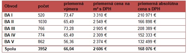 Celková cena predaných bytov dosiahla necelých 158 tisíc s DPH, čím medziročne poklesla o takmer 5 %. Z ponuky tak stále odchádzajú celkovo lacnejšie byty, aj keď sú na m² drahšie ako v minulosti. Tento faktor je limitujúci aj celkovými možnosťami financovania cez banku. V ponuke tak ostávajú väčšie a drahšie nehnuteľnosti, ktoré opúšťajú ponuku pomalšie.